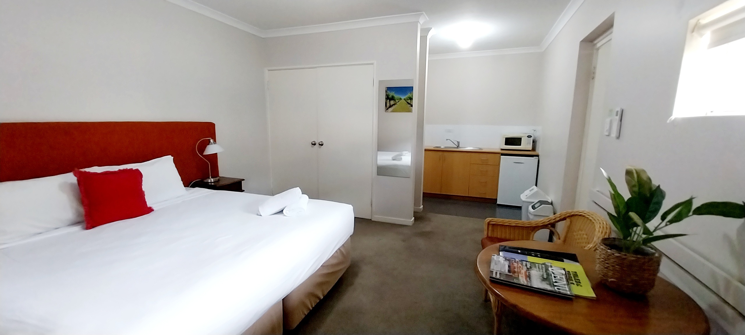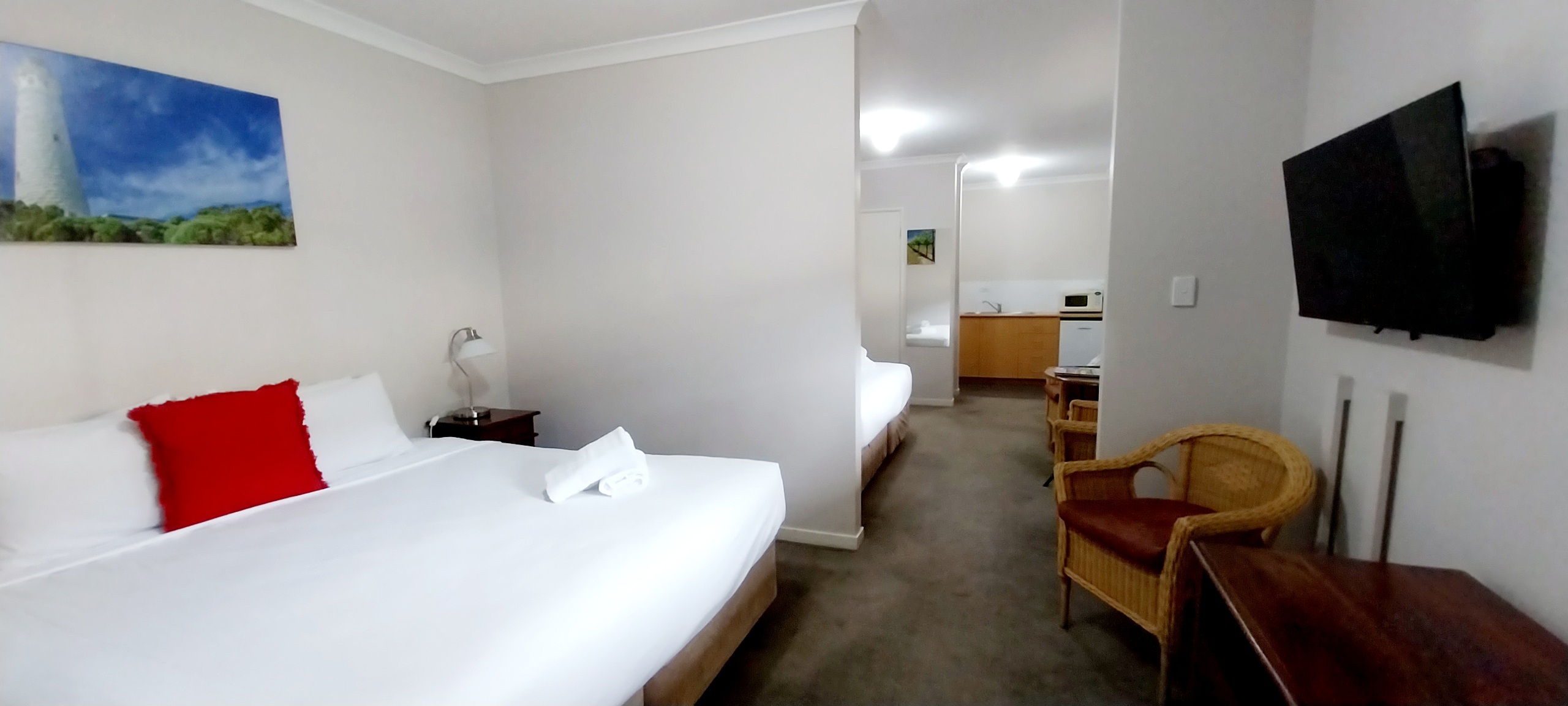Large motel room with two sleeping areas separated by a part wall. One bathroom.